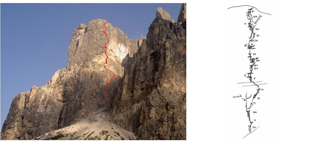 Especially in the middle (yellow zone) the route is very difficult. Most of the time the rock is very good except in the key rope pitch. Fascinating route in a wild landscape.